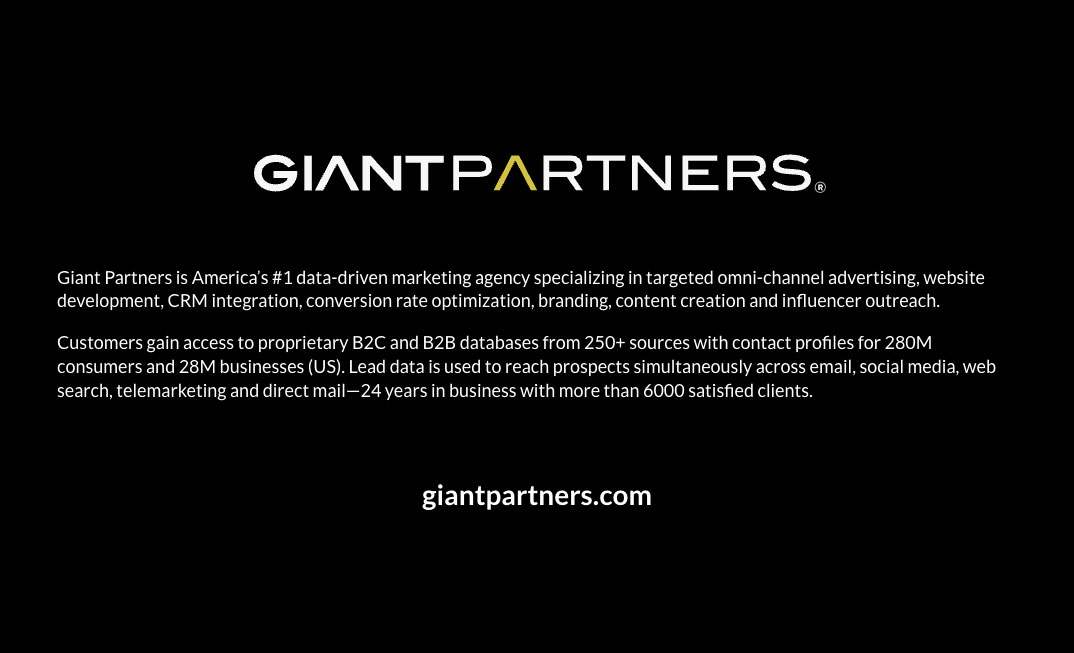 Giant Partners is America’s #1 data-driven marketing agency specializing in targeted omni-channel advertising, website development, CRM integration, conversion rate optimization, branding, content creation and influencer outreach.
