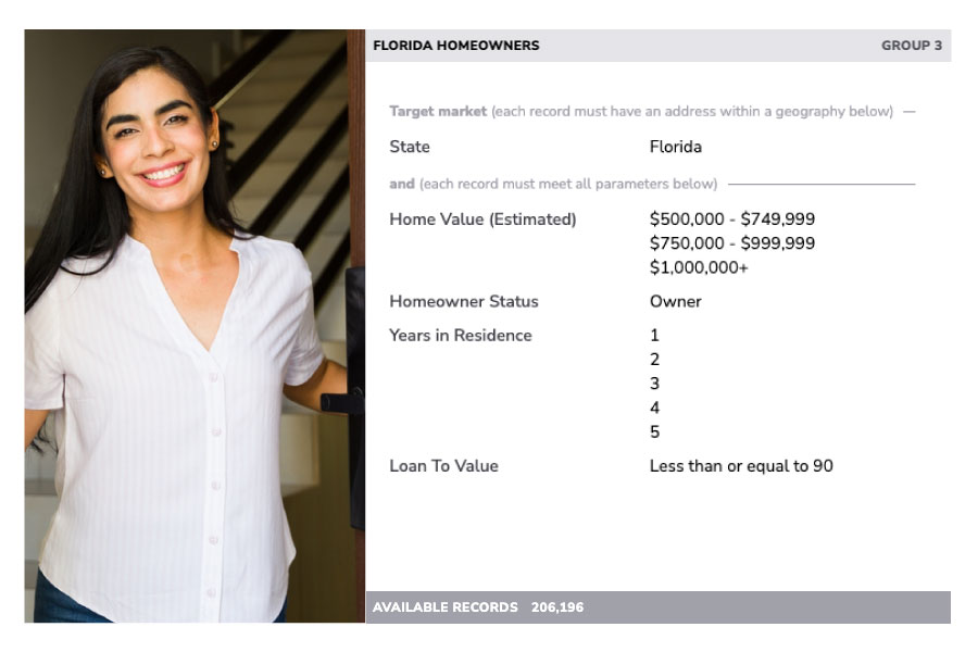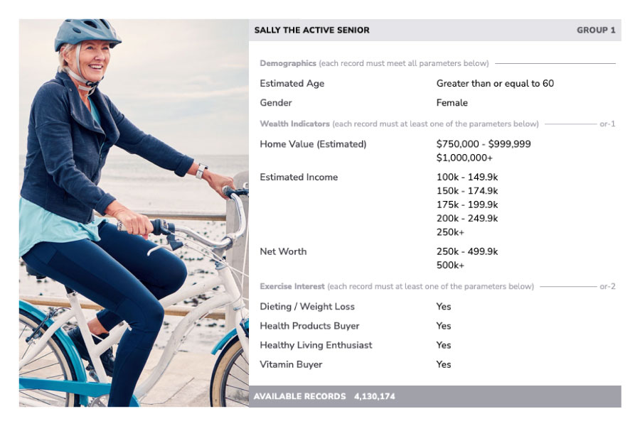 In the modern marketing age, relevance drives results—and that starts with segmenting databases into precise buyer personas. Research shows that segmented marketing campaigns can deliver up to 760% higher revenue (Source: Campaign Monitor) while improving engagement rates across every channel. By building personas around demographics, lifestyle, financial attributes, behaviors, or business characteristics, brands can deliver tailored messaging that resonates—whether through email marketing, social media ads, paid search results, connected TV, direct mail, or phone outreach. This precision targeting not only reduces wasted ad spend but also boosts click-through rates, conversion events, and increases return-on-investment. Check out example personas below: